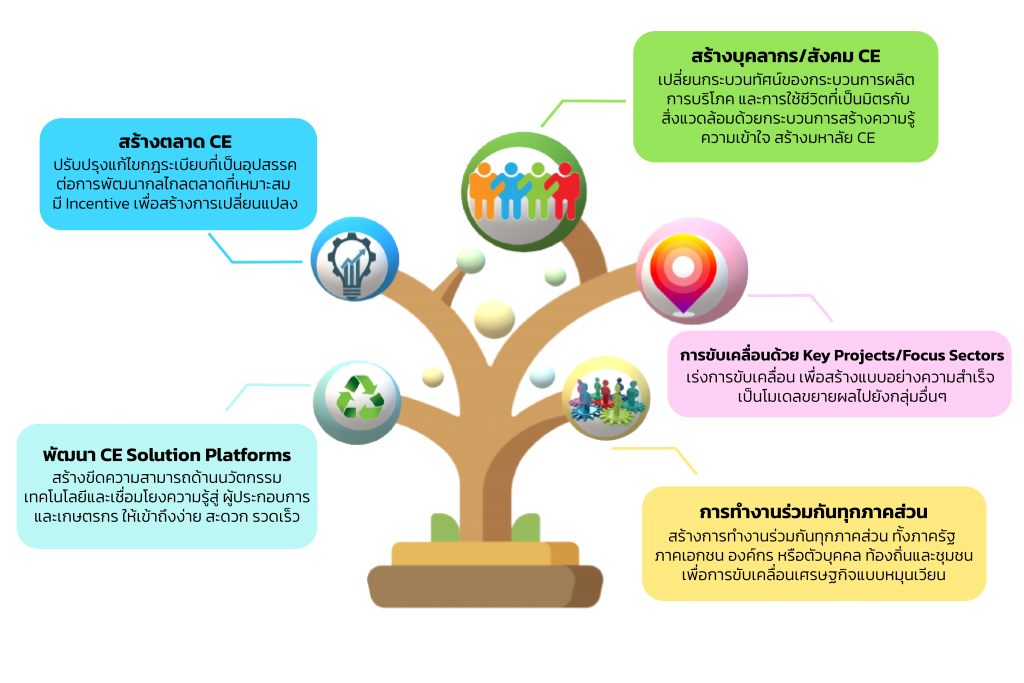 เศรษฐกิจหมุนเวียน เป็นประเด็นยุทธศาสตร์หลักที่เกี่ยวข้องกับ 4 ยุทธศาสตร์เป้าหมายของ BCG ได้แก่ เกษตรและอาหาร สุขภาพและการแพทย์ พลังงาน วัสดุและเคมีชีวภาพ การท่องเที่ยวและเศรษฐกิจสร้างสรรค์ โดยเศรษฐกิจหมุนเวียนได้รับการยอมรับว่าจะช่วยสร้างการเติบโตทางเศรษฐกิจของโลกเพิ่มขึ้นประมาณ 4.5 ล้านล้านเหรียญสหรัฐ โดยใช้ทรัพยากรที่น้อยลง รวมถึงเป็นการสร้างสังคมแห่งความยั่งยืนอีกทั้งยังเป็นรูปแบบการฟื้นฟูระบบเศรษฐกิจหลังจาดการระบาดของไวรัสโควิด 19